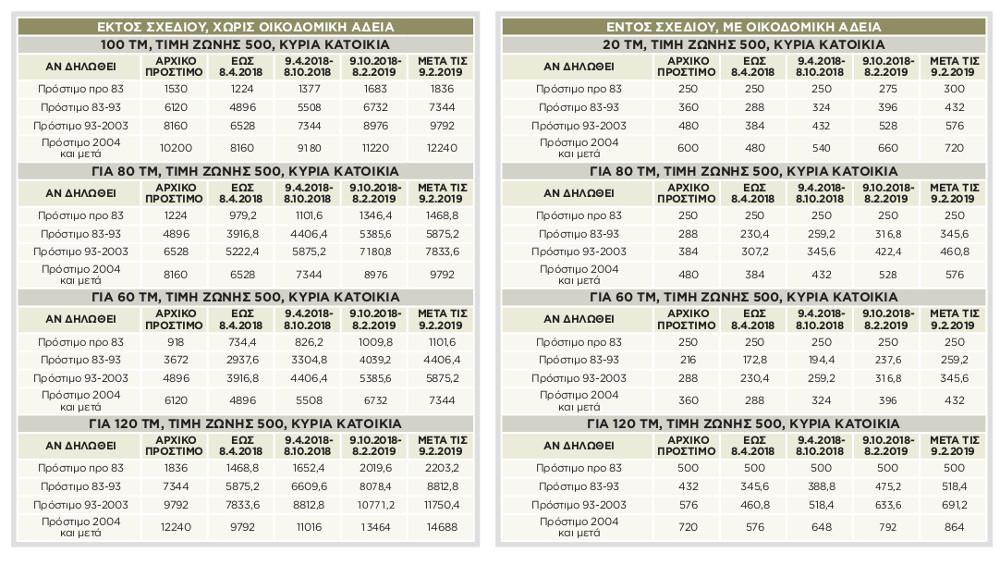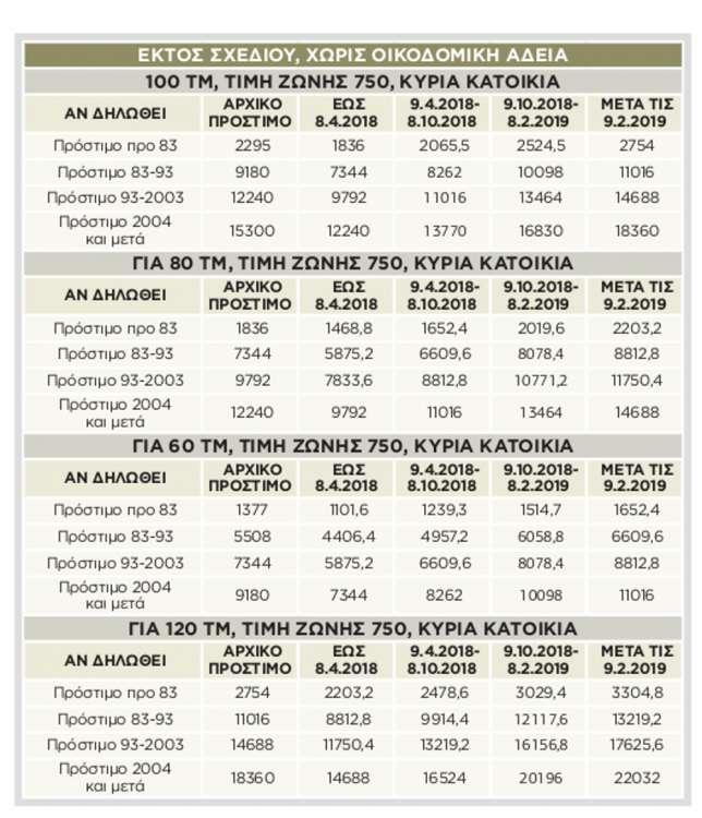 Τα αυθαίρετα από 1ης.1.1983 έως 1η.1.1993 νομιμοποιούνται με την πληρωμή παραβόλου και του 60% του προστίμου, ενώ για αυθαίρετες κατασκευές και αυθαίρετη αλλαγή χρήσης από 1ης.1.1993 έως 31.12.2003 καταβάλλεται ποσοστό 80% του ενιαίου ειδικού προστίμου. Από 1η.1.2004 έως 28.7.2011 καταβάλλεται το παράβολο και το 100% του προστίμου. Για τα αυθαίρετα με παρανομίες άνω του 40%, η οριστική εξαίρεση από την κατεδάφιση θα γίνει με επιπλέον αγορά συντελεστή, όταν ετοιμαστεί το σχετικό ηλεκτρονικό σύστημα.