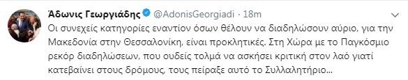 Συγκεκριμένα, στον προσωπικό του λαογαριασμό στο Twitter, o κ. Γεωργιάδης έγραψε: «Οι συνεχείς κατηγορίες εναντίον όσων θέλουν να διαδηλώσουν αύριο, για την Μακεδονία στην Θεσσαλονίκη, είναι προκλητικές.