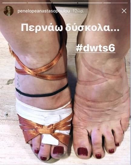 Το αποκάλυψε η Πηνελόπη Αναστασοπούλου, η οποία από τις πολλές πρόβες ώστε να αποδώσει όσο καλύτερα μπορεί στην πρεμιέρα του λαμπερού σόου στις 26 Ιανουαρίου, έχει πληγιάσει τα πόδια της. Μάλιστα ανέβασε φωτογραφία από τα τραυματισμένα -ελαφρώς βέβαια- πόδια της με την παραδοχή: “περνάω δύσκολα”.