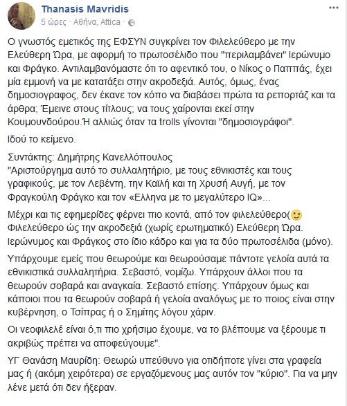 «Ο γνωστός εμετικός της ΕΦΣΥΝ συγκρίνει τον Φιλελεύθερο με την Ελεύθερη Ώρα, με αφορμή το πρωτοσέλιδο που “περιλαμβάνει” Ιερώνυμο και Φράγκο. Αντιλαμβανόμαστε.. ότι το αφεντικό του, ο Νίκος ο Παππάς, έχει μία εμμονή να με κατατάξει στην ακροδεξιά. Αυτός, όμως, ένας δημοσιογραφος, δεν έκανε τον κόπο να διαβάσει πρώτα τα ρεπορτάζ και τα άρθρα; Έμεινε στους τίτλους; να τους χαίρονται εκεί στην Κουμουνδούρου. Ή αλλιώς όταν τα trolls γίνονται “δημοσιογράφοι”.