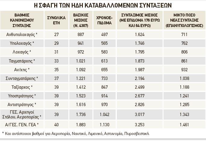 Όσοι αποστρατεύτηκαν με χαμηλούς βαθμούς από το Στρατό Ξηράς, π.χ. ανθυπολοχαγού, λοχαγού, ταγματάρχη και ομοιόβαθμοι σε Αεροπορία και Ναυτικό, θα δουν τις συντάξεις τους να πέφτουν κατά 25 ευρώ, ενώ όσοι αποστρατεύτηκαν με υψηλότερους βαθμούς, δηλαδή αντισυνταγματάρχη, συνταγματάρχη, ταξίαρχου κ.λπ., και ομοιόβαθμοί τους σε Αεροπορία και Ναυτικό, θα έχουν μειώσεις 35 ως και 80 ευρώ το μήνα στα καθαρά τους ποσά.