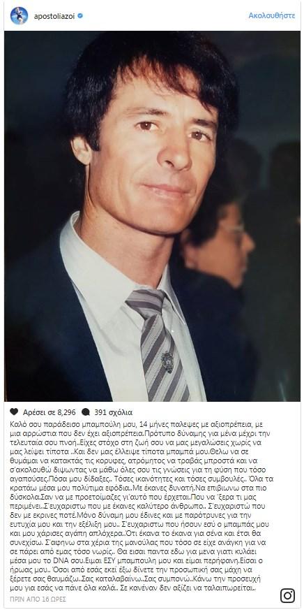 Λίγες μέρες μετά την μεγάλη της απώλεια, η Αποστολία Ζώη συγκινεί με όσα γράφει στο instagram της για τον μπαμπά της: