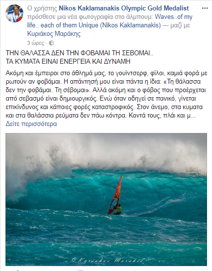 Ακόμη και έμπειροι στο άθλημά μας, το γουίντσερφ, φίλοι, καμιά φορά με ρωτούν αν φοβάμαι. Η απάντησή μου είναι πάντα η ίδια: «Τη θάλασσα δεν την φοβάμαι. Τη σέβομαι». Αλλά ακόμη και ο φόβος που προέρχεται από σεβασμό είναι δημιουργικός. Ενώ όταν οδηγεί σε πανικό, γίνεται επικίνδυνος και κάποιες φορές καταστροφικός. Στον άνεμο, στα κυματα και στα θαλάσσια ρεύματα δεν πάω κόντρα. Κοντά τους, πλάι και μαζί τους πάω. Ζω στο «εδώ και τώρα», εναλλάσσοντας ταπεινότητα και αυτοπεποίθηση. Το μόνο ίσως που με τρομάζει είναι να ζήσω μια «φυσιολογική» ζωή μακριά από τη Θάλασσα και τα όνειρά μου. Εύχομαι και ελπίζω τα ακραία καιρικά φαινόμενα των τελευταίων ημερών να μην βλάπτουν συνανθρώπους μας!