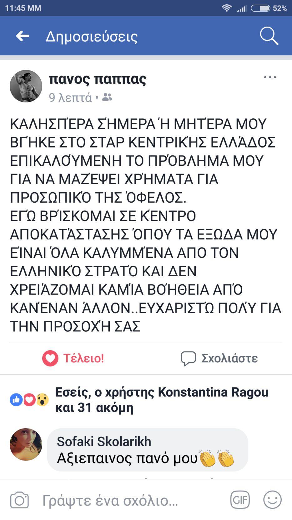 Δείτε την ανάρτηση του γιου της στο Facedook μετά την εμφάνιση της μητέρας στο τοπικό κανάλι Star Κεντρικής Ελλάδας, όπου κρατώντας τη φωτογραφία του αλεξιπτωτιστή γιου της, ζητούσε βοήθεια για προσωπικό της όφελος.