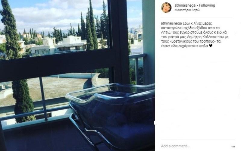 «Εδώ και λίγες μέρες, καταστρώνει σχέδιο εξόδου από το Λητώ. Τους ευχαριστούμε όλους κ ειδικά τον γιατρό μας Δημήτρη Κολέσκα που με τους “βρετανικούς του τρόπους” τα έκανε όλα ευχάριστα και απλά», έγραψε δίπλα από το στιγμιότυπο.