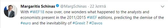 Ο Έλληνας αξιωματούχος και εκ των πλέον στενών συνεργατών του Ζαν Κλοντ Γιουνκέρ έγραψε σε ανάρτησή του στο Twitter: “Τώρα που τελείωσε το Παγκόσμιο Οικονομικό Φόρουμ, είναι να αναρωτιέται κανείς τι απέγιναν όλοι εκείνοι οι αναλυτές και οικονομολόγοι, που έδιναν το παρών στο Φόρουμ από το 2011 ως το 2015, και προέβλεπαν τη διάλυση του ευρώ και Grexit;”