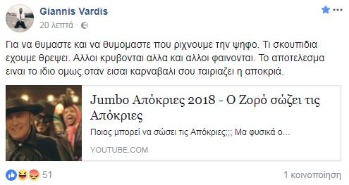 «Για να θυμάστε και να θυμόμαστε που ρίχνουμε την ψήφο. Τι σκουπίδια έχουμε θρέψει. Άλλοι κρύβονται αλλά και άλλοι φαίνονται. Το αποτέλεσμα είναι το ίδιο όμως. Όταν είσαι καρναβάλι σου ταιριάζει η αποκριά».