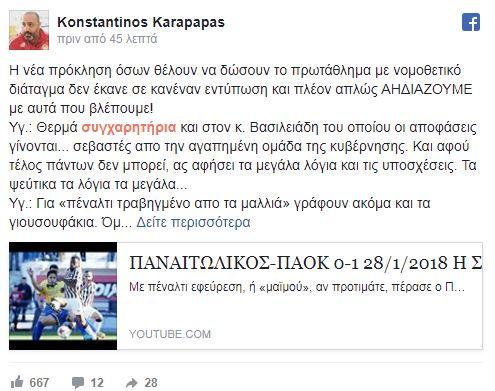 Πιο συγκεκριμένα το ποστάρισμα του Καραπαπά στο Facebook: