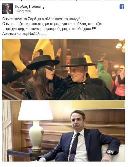 Με ένα αιχμηρό σχόλιο στο facebook, ο αναπληρωτής υπουργός υγείας Παύλος Πολάκης, έβαλε στο στόχαστρό του τον Παναγιώτη Ψωμιάδη που ξαναντύθηκε Ζορό για να «σώσει τις απόκριες» σε διαφημιστικό σποτ και τον Προέδρο της ΝΔ, Κυριάκο Μητσοτάκη, για τον οποίο αναφέρει «έκανε μούτρα» επειδή δεν ήθελε ήχο στη συνάντηση που είχε το Σάββατο το πρωί με τον πρωθυπουργό.