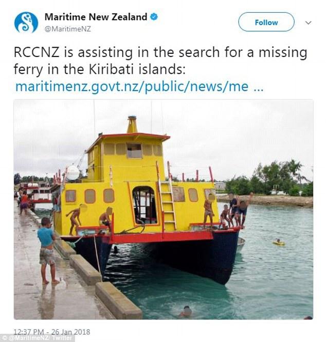 Οι έρευνες ξανάρχισαν με το πρώτο φως τη Δευτέρα, πρόσθεσε ο ανώτερος νεοζηλανδός αξιωματικός. Το MV Butiraoi, ένα ξύλινο καταμαράν μήκους 17,5 μέτρων, αναχώρησε τη 18η Ιανουαρίου από την ατόλη Νονούτι για το Μπέτιο, στην ατόλη Ταράουα, στα νησιά Κιριμπάτι, ένα ταξίδι που χρειαζόταν έναν περίπλου 260 χιλιομέτρων και θα διαρκούσε δύο ημέρες. Κηρύχθηκε αγνοούμενο την 20ή Ιανουαρίου.