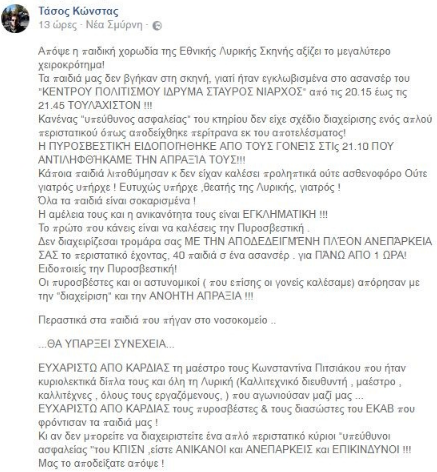 «Την παρουσία πυροσβεστών και γιατρού υπηρεσίας σε ΚΑΘΕ παράσταση της ΕΛΣ και όλων των κρατικών σκηνών είναι το αυτονόητο που πρέπει να εξασφαλίσει το ανάξιο αυτό κράτος ΤΩΡΑ, που μεριμνά για την ασφάλεια των πολιτικών και αδιαφορεί εγκληματικά γι αυτή των πολιτών… Τη συμπαράσταση μου στα υπέροχα παιδιά της χορωδίας που εγκλωβίστηκαν για περισσότερο από μιάμιση ώρα στο ασανσέρ, «έχασαν» την είσοδο τους στην παράσταση αλλά όχι το χαμόγελο τους» έγραψε στη σελίδα του στο Facebook.