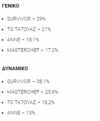 Συνωστισμός πρώτη γραμμής στη χθεσινή prime time. Survivor, Τατουάζ, MasterChef αλλά και η Αννέ κονταροχτυπήθηκαν άγρια για την τηλεθέαση. Τα συμπεράσματα που προκύπτουν από τα σημερινά ποσοστά έχουν αρκετό ενδιαφέρον.