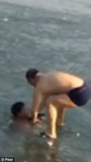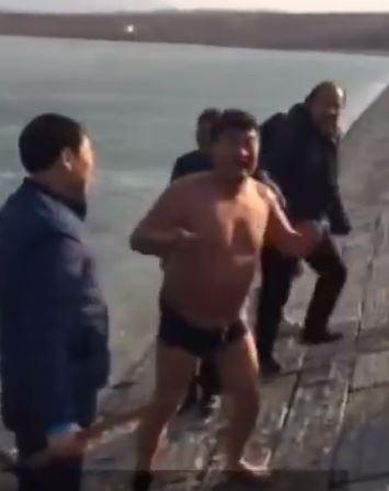 Τα πλάνα δείχνουν τον τολμηρό κολυμβητή να παίρνει βαθιά βαθιά ανάσα πριν βυθιστεί στο παγωμένο νερό ενός ποταμού στην επαρχία Shandong.