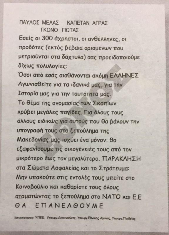 Όσοι από εσάς αισθάνονται Έλληνες αγωνισθείτε για τα ιδανικά μας, για την Ιστορία μας, για την ταυτότητά μας. Το θέμα της ονομασίας των Σκοπίων κρύβει μεγάλες παγίδες. Για όλους τους άλλους ειδικώς για αυτούς που θα βάλουν την υπογραφή τους στο ξεπούλημα της Μακεδονίας μας ισχύει ένα και μόνον: θα εξαφανίσουμε τις οικογένειές τους από τον μικρότερο έως τον μεγαλύτερο.