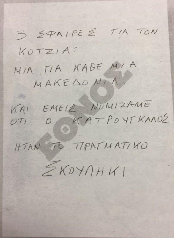 Ήταν χειρόγραφη και ο αποστολέας είχε γράψει με μαύρο στυλό: «3 σφαίρες για τον Κοτζιά. Μια για κάθε μια Μακεδονία. Και εμείς νομίζαμε ότι ο Κατρούγκαλος ήταν το πραγματικό σκουλίκι».