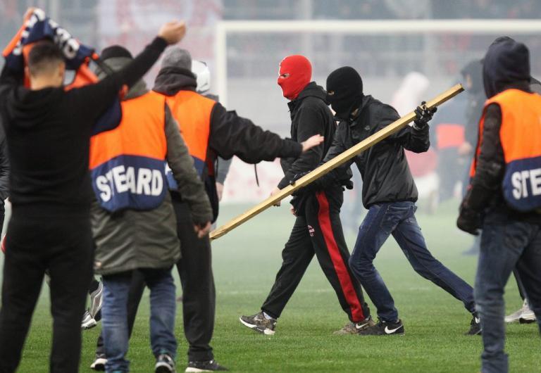 «Ντου» των οπαδών του Ολυμπιακού στο «Γ. Καραϊσκάκης» μετά τη λήξη του αγώνα με την ΑΕΚ.