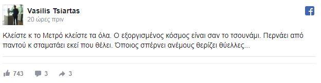 «Κλείστε κ το Μετρό κλείστε τα όλα. Ο εξοργισμένος κόσμος είναι σαν το τσουνάμι. Περνάει από παντού κ σταματάει εκεί που θέλει. Όποιος σπέρνει ανέμους θερίζει θύελλες…», αναφέρει στον προσωπικό του λογαριασμό στο Facebook.
