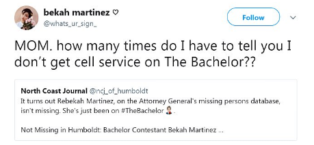 Κι όμως, η Ρεμπέλα Μαρτίνεθ από το Χάμπολτ της Καλιφόρνια δεν είχε χαθεί, απλά συμμετείχε στο ριάλιτι σόου «Τhe Bachelor», χωρίς να σκεφτεί πριν να ειδοποιήσει τη μητέρα της!