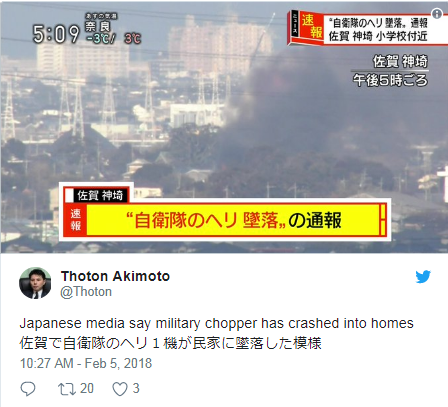 “Ένα ελικόπτερο των Δυνάμεων Αυτοάμυνας συνετρίβη σε κατοικημένη περιοχή. Πυρκαγιά ξέσπασε σε ένα σπίτι”, δήλωσε ο Κατσουχίντε Τανάκ, αξιωματούχος της πόλης Κανζάκι όπου σημειώθηκε το περιστατικό.