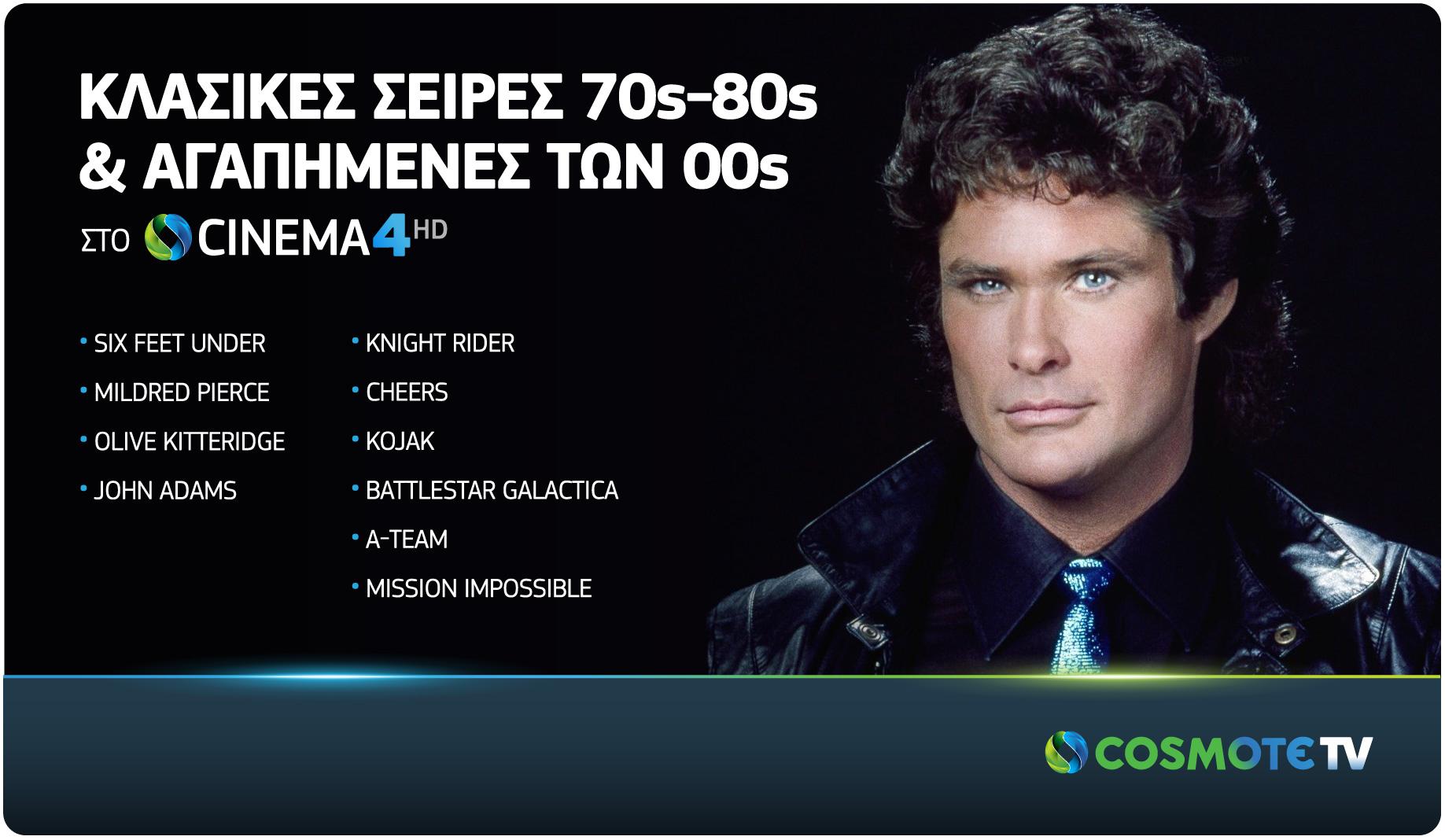 Στο COSMOTE CINEMA 4HD προβάλλονται και θρυλικές σειρές της δεκαετίας το ’80, όπως το κωμικό Cheers (1982-1993) με τους Τεντ Ντάνσον, Γούντι Χάρελσον και Κίρστι Άλλεϊ και το Knight Rider (1982-1986) με τον Ντέιβιντ Χάσελχοφ, αλλά και παλαιότερες επιτυχίες με «δικούς» μας Ελληνοαμερικάνους πρωταγωνιστές, όπως η διάσημη αστυνομική σειρά Kojak (1973-1978) με τον Τέλι Σαβάλας η sci-fi σειρά Battlestar Galactica (1978-1979) και το Α-ΤΕΑΜ (1983-1987) με τον Τζώρτζ Πέπαρντ. Συνεχίζονται και ολοκληρώνονται επίσης οι κύκλοι της σειράς Mission Impossible (1966 -1973).