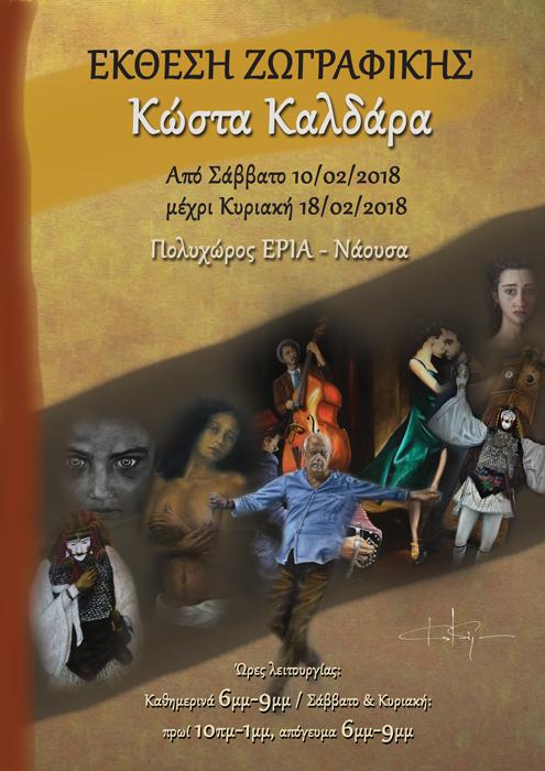 Το Σάββατο 10/02 στις 7μμ. εγκαινιάζεται στον πολυχώρο “ΈΡΙΑ” η ατομική έκθεση ζωγραφικής του συνθέτη Κώστα Καλδάρα η οποία θα διαρκέσει έως και την Κυριακή 18 Φεβρουαρίου 2018.