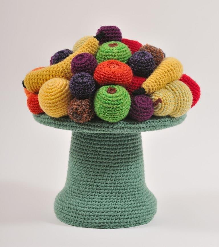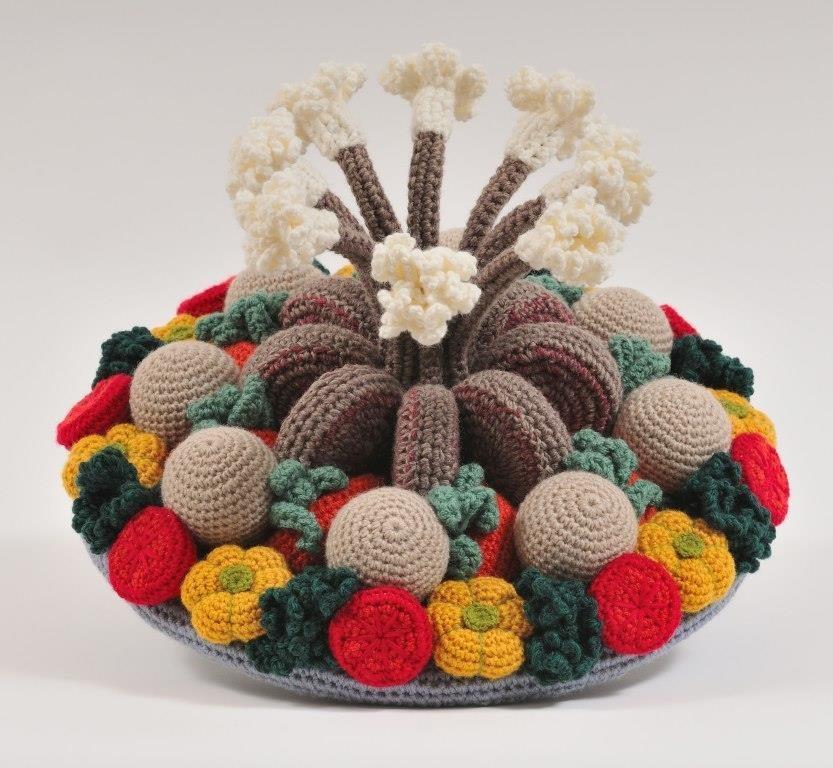 Για τα φρούτα και τα λαχανικά, ο Τρέβορ πλέκει με βελονάκι γύρω από σχήματα από πολυεστέρα. Χρησιμοποιεί ειδικές τεχνικές για να δώσει λεπτομέρειες στα φύλλα και τα λουλούδια. Και ράβει όλα αυτά τα μέρη, στην τελική σύνθεση.