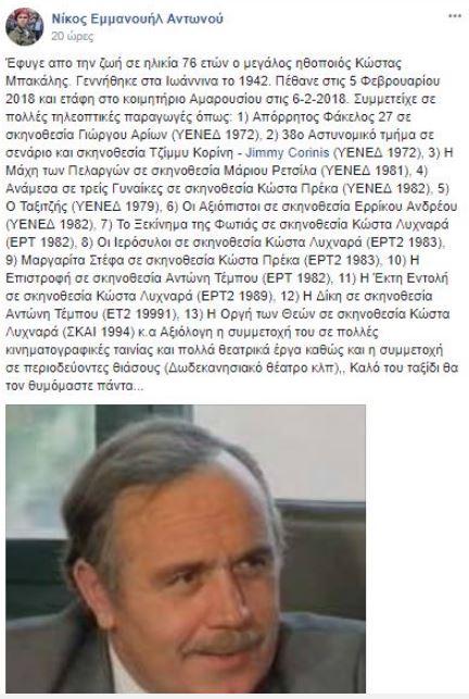 Σύμφωνα με την ανάρτηση οποία ο ηθοποιός «έφυγε» την Δευτέρα που μας πέρασε και ετάφη μία ημέρα μετά, στο κοιμητήριο Αμαρουσίου.