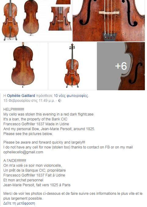 Η 43χρονη βραβευμένη μουσικός, Οφιλί Γκαγιάρντ, απηύθυνε έκκληση μέσω Facebook για το τσέλο και στη συνέχεια έλαβε ένα ανώνυμο τηλεφώνημα με το οποίο την ενημέρωναν ότι μουσικό όργανο βρισκόταν σε αυτοκίνητο έξω από το σπίτι της.