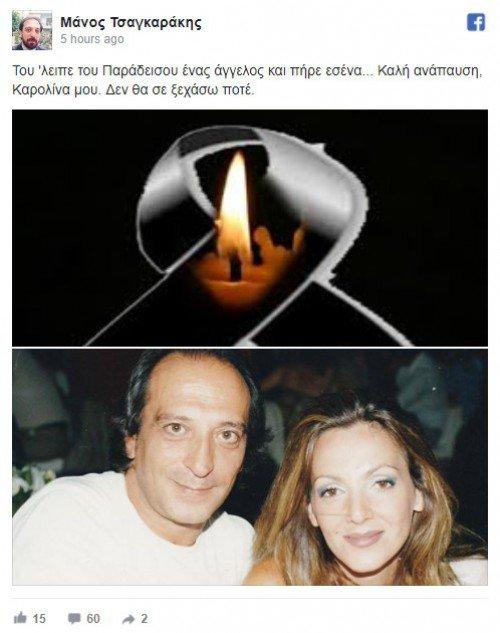 Η Καρoλiνα Κάλφα, που εκτός από την παρουσίαση των δελτίων ειδήσεων στoν AΝΤ1, έχει αρθρογραφήσει σε αρκετά μέσα μαζικής ενημέρωσης και εργαζόταν μεταξύ άλλων και στo ALTER. Η Καρολίνα ήταν 50 ετών και είχε ένα γιο.