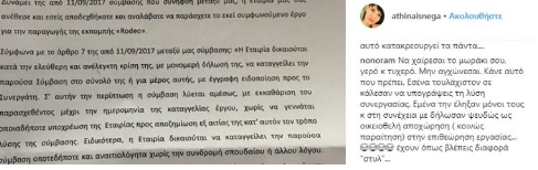Κάτω από την εν λόγω ανάρτηση, η Ελεωνόρα Μελέτη έγραψε τα ακόλουθα: «Να χαίρεσαι το μωράκι σου, γερό κ τυχερό. Μην αγχώνεσαι. Κάνε αυτό που πρέπει. Εσένα τουλάχιστον σε κάλεσαν να υπογράψεις τη λύση συνεργασίας. Εμένα την έληξαν μόνοι τους κ στη συνέχεια με δήλωσαν ψευδώς ως οικειοθελή αποχώρηση ( κοινώς παραίτηση) στην επιθεώρηση εργασίας…έχουν όπως βλέπεις διάφορα «στυλ»…»