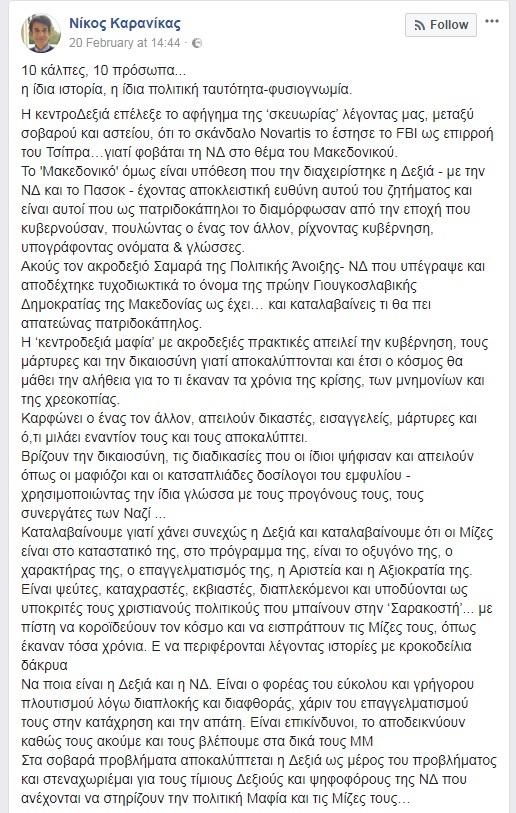 Με ένα «εμπρηστικό» κείμενο στο Facebook σχολίασε ο Νίκος Καρανίκας, σύμβουλος στρατηγικής του πρωθυπουργού, τα όσα συνέβησαν την Τετάρτη στη Βουλή, κατά τη συζήτηση για τη σύσταση προανακριτικής επιτροπής για την υπόθεση Novartis.