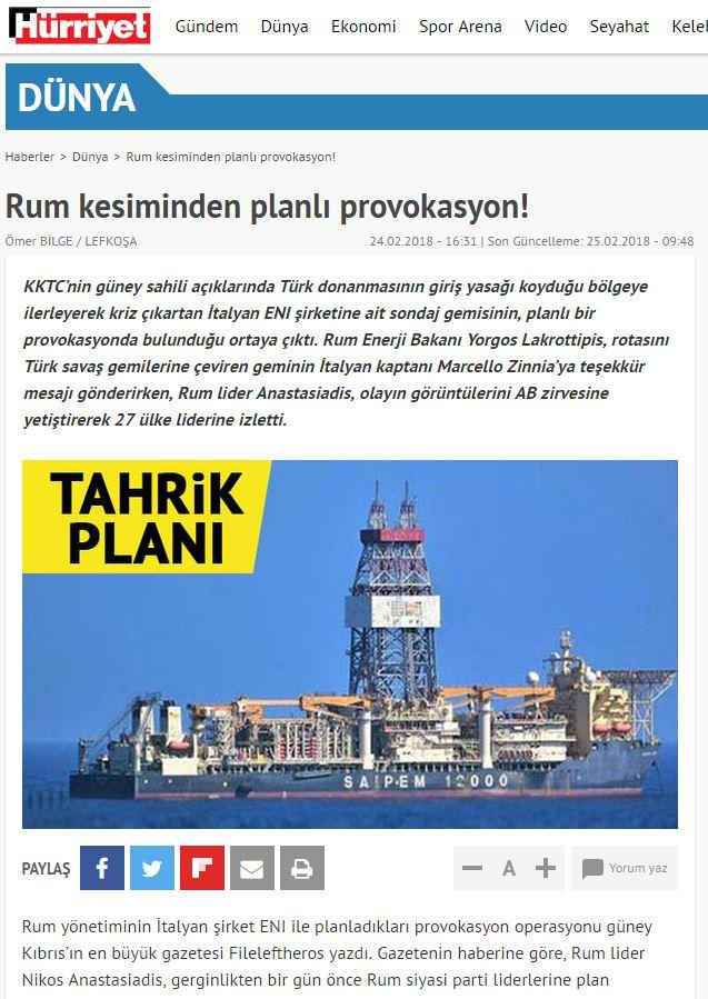 Μάλιστα αναφερόμενη στην προσπάθεια προσέγγισης της περιοχής όπου είναι προγραμματισμένη η γεώτρηση στο οικόπεδο 3, η εφημερίδα σημειώνει ότι «πρόκειται για προβοκάτσια των ελληνοκυπρίων για να πάνε το θέμα στην άτυπη Σύνοδο Κορυφής της ΕΕ» (σ.σ την Παρασκευή).