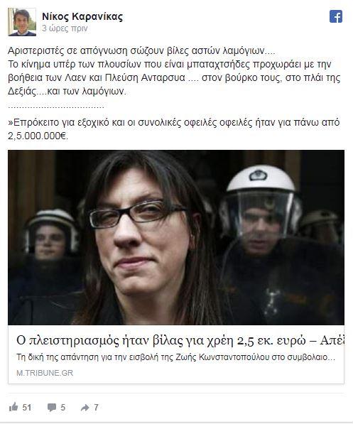 Στο στόχαστρο του Νίκου Καρανίκα βρέθηκε η Ζωή Κωνσταντοπούλου, η Λαϊκή Ενότητα του Παναγιώτη Λαφαζάνη και η ΑΝΤΑΡΣΥΑ για τη στάση τους απέναντι στους πλειστηριασμούς χαρακτηρίζοντάς τους «κίνημα υπέρ των πλουσίων».