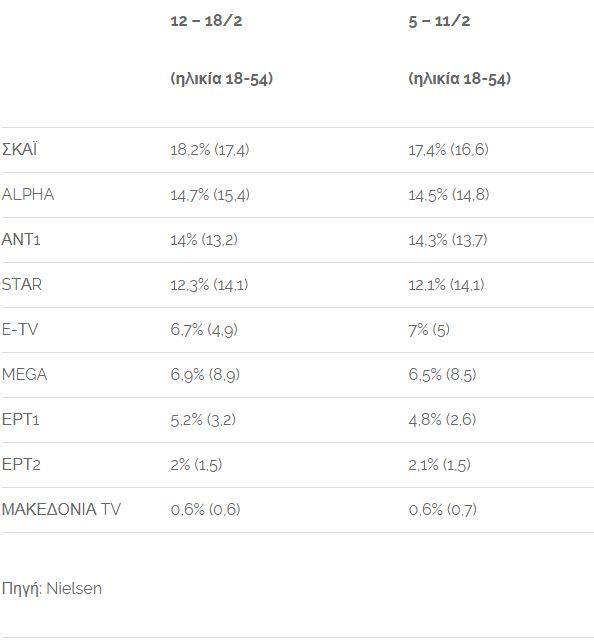 Παρά τις αυξομειώσεις στην τηλεθέαση, ο ΣΚΑΪ παρέμεινε κυρίαρχος και την περασμένη εβδομάδα, και μάλιστα με μεγάλη διαφορά από τον πάντα δεύτερο Alpha.