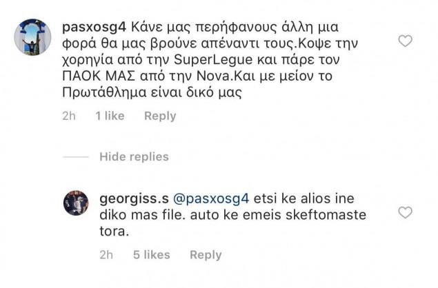 «Κάνε μας περήφανους, άλλη μια φορά θα μας βρουν απέναντί τους. Κόψε την χορηγία από την Super League και πάρε τον ΠΑΟΚ μας από τη Nova. Και με μείον το πρωτάθλημα είναι δικό μας», έγραψε ένας φίλος του «Δικεφάλου» στο προφίλ του Γιώργου Σαββίδη στο Instagram, το οποίο έχει «βομβαρδιστεί» από εκατοντάδες μηνύματα, μετά τη μη διεξαγωγή του ντέρμπι με τον Ολυμπιακό.