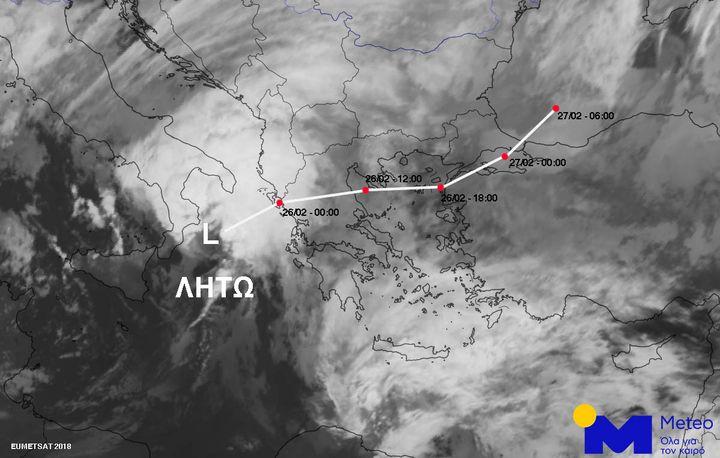 Το βαρομετρικό χαμηλό «Λητώ» προκαλεί νέα επιδείνωση του καιρού από την Κυριακή το βράδυ έως και τη Δευτέρα 26 Φεβρουαρίου, αρχικά στο Ιόνιο και στη συνέχεια και στην υπόλοιπη χώρα, με ισχυρές βροχές και καταιγίδες, πυκνές χιονοπτώσεις όχι μόνο στα ορεινά, αλλά και σε περιοχές της βόρειας χώρας με χαμηλό υψόμετρο, θυελλώδεις ανέμους στα πελάγη και σημαντική πτώση της θερμοκρασίας. Η «Λητώ» θα κινηθεί γρήγορα ανατολικά-βορειοανατολικά με αποτέλεσμα τη γρήγορη βελτίωση του καιρού μέσα στη Δευτέρα.