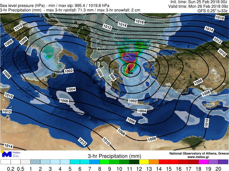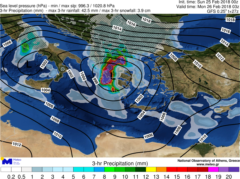 Η θέση του βαρομετρικού χαμηλού το απόγευμα της Κυριακής 25/02 (20:30 ώρα Ελλάδος) και η εκτιμώμενη πορεία του μέχρι τα ξημερώματα της Τρίτης 27/02 φαίνονται στο παρακάτω γράφημα: