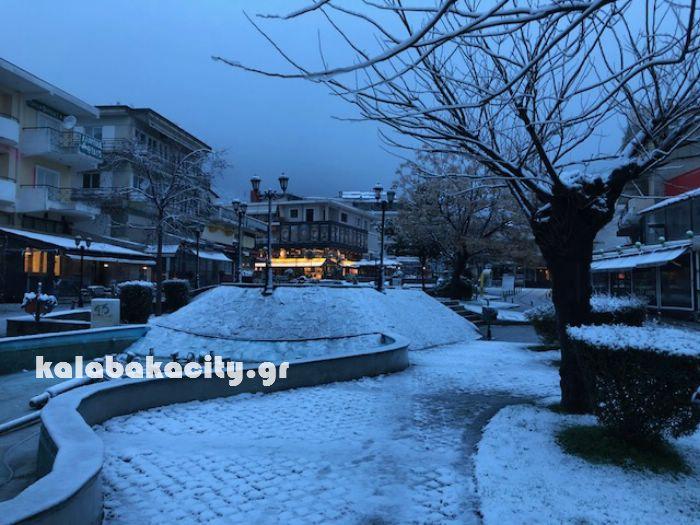 Ντυμένη στα Λευκά ξύπνησε η Καλαμπάκα σήμερα Δευτέρα από την χιονόπτωση που ξεκίνησε να πέφτει από το βράδυ τόσο στην πόλη όσο και στην γύρω περιοχή.