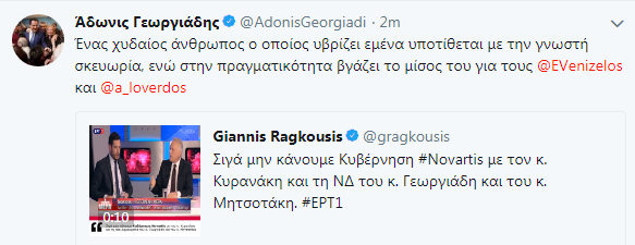 Συγκεκριμένα, ο κ. Γεωργιάδης, σε ανάρτησή του στο Twitter ο κ. Γεωργιάδης έγραψε για τον κ. Ραγκούση: «Ένας χυδαίος άνθρωπος ο οποίος υβρίζει εμένα υποτίθεται με την γνωστή σκευωρία, ενώ στην πραγματικότητα βγάζει το μίσος του για τους @EVenizelos και @a_loverdos».