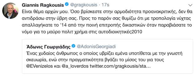 Απαντώντας στον Άδωνι Γεωργιάδη, ο Γιάννης Ραγκούσης έγραψε στο Twitter: «Είναι θέμα αρχών μου. Όσο βρίσκεστε στην αρμοδιότητα προανακριτικής, δεν θα αντιδράσω στην ύβρη σας. Προς το παρόν σας θυμίζω ότι με τροπολογία νύχτας απαλλαγήκατε το ’14 από την ποινή επιτροπής δικαστικών όταν παραβιάσατε το νόμο για το μαύρο πολιτικό χρήμα στις αυτοδιοικητικές 2010».