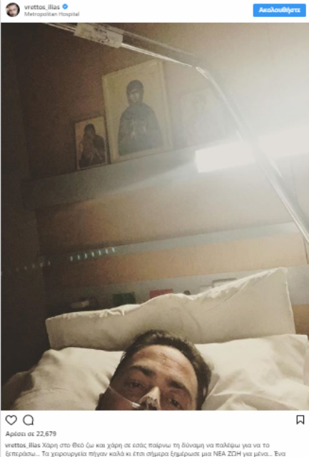 Όλα πήγαν κατ’ ευχήν για τον Ηλία Βρεττό μετά το σοβαρό τροχαίο που είχε την Καθαρά Δευτέρα. Το δύσκολο χειρουργείο στη λεκάνη πραγματοποιήθηκε με επιτυχία και πλέον, ο τραγουδιστής αναρρώνει… Ο γνωστός τραγουδιστής μπιράστηκε, μάλιστα, τα χαρμόσυνα νέα με τους διαδικτυακούς του φίλους αναρτώντας μια φωτογραφία από το νοσοκομείο. Για λεζάντα έγραψε τα εξής: «Χάρη στο Θεό ζω και χάρη σε εσάς παίρνω τη δύναμη να παλέψω για να το ξεπεράσω… Τα χειρουργεία πήγαν καλά κι έτσι σήμερα ξημέρωσε μια ΝΕΑ ΖΩΗ για μένα… Ένα πράγμα ΜΟΝΟ θέλω να πω… ΕΥΧΑΡΙΣΤΩ».