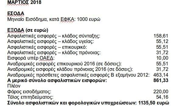 Σημειώνεται ότι το παράδειγμα που ακολουθεί περιλαμβάνει το σύνολο των πραγματικών επιβαρύνσεων που θα έχει τον Μάρτιο του 2018, σύμφωνα με όσες ρυθμίσεις έχουν ψηφισθεί και ανακοινωθεί: