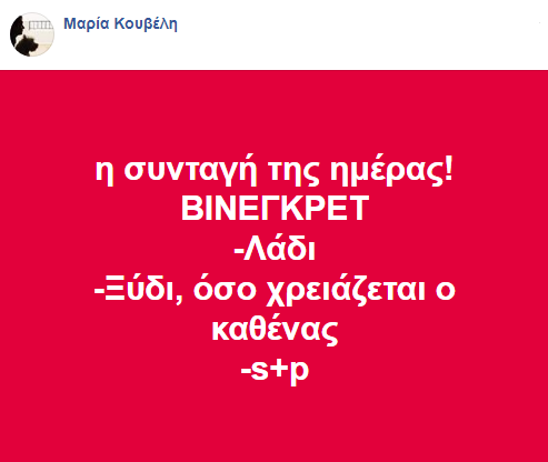 Ουσιαστικά, η Μαρία Κουβέλη χρησιμοποίησε την γνωστή έκφραση «ξυδάκι…», καθώς έγραψε: «Η συνταγή της μέρας. Βινεγκρέτ. Λάδι, ξύδι όσο χρειάζεται ο καθένας, s + p (σ.σ αλάτι και πιπέρι)».