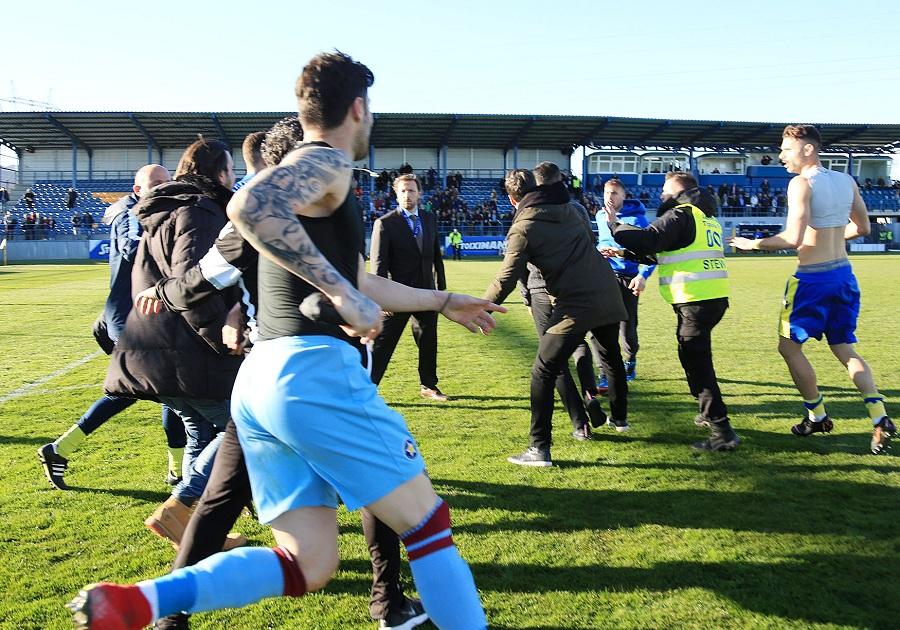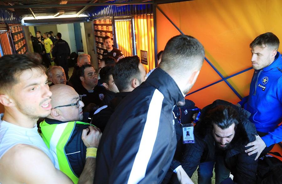 Μάλιστα, τόσο ο υπεύθυνος επικοινωνίας των «ασπρόμαυρων», Κυριάκος Κυριάκος, όσο και εκείνος του Αστέρα, Γιάννης Ντάλας, αλλά και άλλα μέλη των δύο ΠΑΕ, δεν κατάφεραν να τον συγκρατήσουν, με τον οργισμένο Κωνσταντινίδη να ορμά στον Καλτσά, προσπαθώντας να τον πιάσει από το κεφάλι.