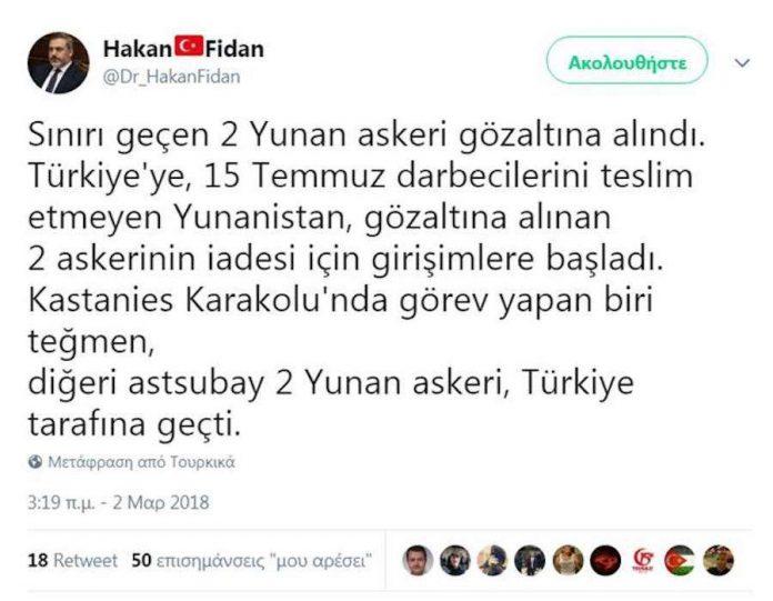 Ειδικότερα πηγές του ΥΠΕΞ ανέφεραν στο Militaire.gr ότι «το tweet του επικεφαλής της ΜΙΤ Χακάν Φιντάν σε σχέση με τους δύο στρατιωτικούς, δεν θα πρέπει να αποδοθεί ως προσωπικό σχόλιο του ιδίου, παρά το γεγονός ότι ο συγκεκριμένος λογαριασμός έχει τη φωτογραφία και το όνομά του, μιας και ο λογαριασμός δεν ανήκει επίσημα στον ίδιο αλλά σε υποστηρικτές του».
