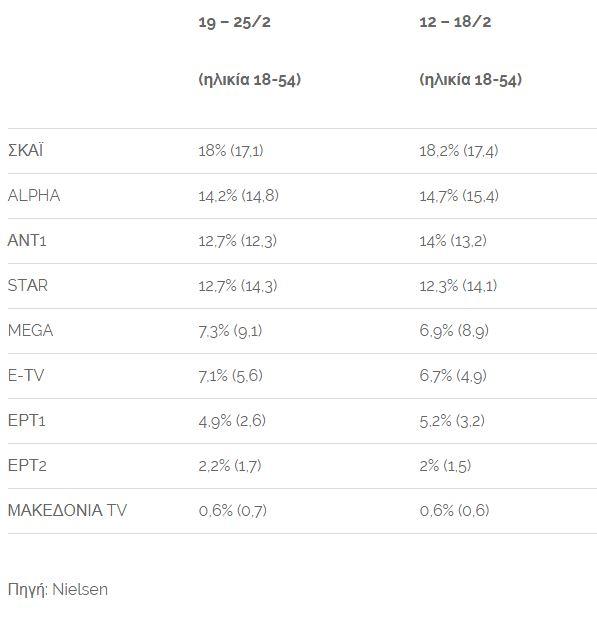 Μικρή υποχώρηση της τηλεθέασης για τους κυρίαρχους της τηλεόρασης την περασμένη εβδομάδα, σύμφωνα με τα στοιχεία της Nielsen.