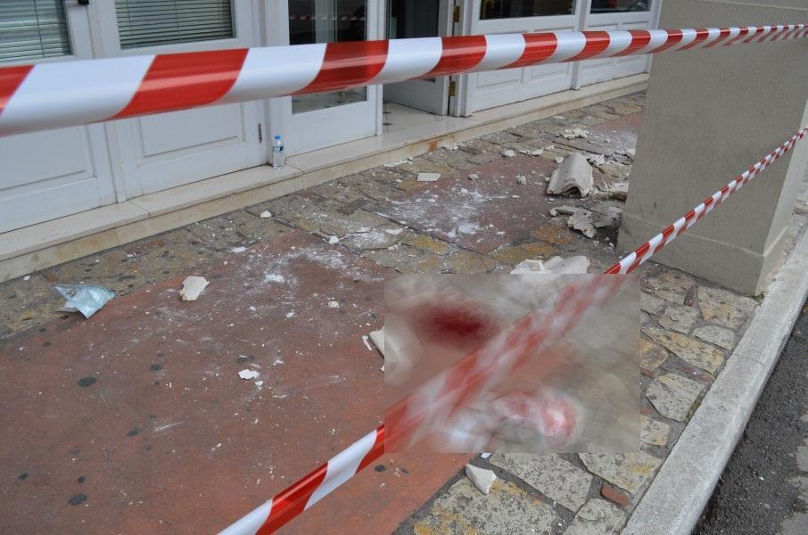 Η γυναίκα, λίγο μετά τις 12 το μεσημέρι, περνούσε έξω από την τράπεζα όταν ξαφνικά μεγάλο κομμάτι από τη γύψινη διακόσμηση της οροφής ξεκόλλησε και έπεσε στο κεφάλι της, τραυματίζοντάς τη σοβαρά. Η γυναίκα από τη σφοδρότητα του χτυπήματος έπεσε στο πεζοδρόμιο και αιμορραγούσε.
