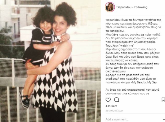 Η Πόπη Τσαπανίδου με αφορμή την Παγκόσμια Ημέρα της Γυναίκας δημοσίευσε μια φωτογραφία της που τραβήχτηκε πριν από 25 χρόνια στην οποία απεικονίζεται να κρατά στην αγκαλιά της το πρώτο της παιδί ,κυοφορώντας τα δίδυμά της.