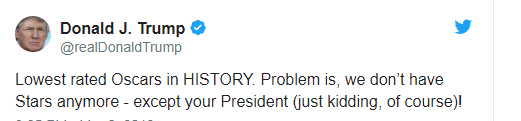 Την περασμένη Τρίτη, ο Πρόεδρος των ΗΠΑ τουίταρε: «Τα Όσκαρ με τη χαμηλότερη τηλεθέαση, στην ΙΣΤΟΡΙΑ. Το πρόβλημα είναι ότι, πια, δεν έχουν Σταρ – εκτός από τον Πρόεδρό σας (αστειεύομαι, βεβαίως)!».