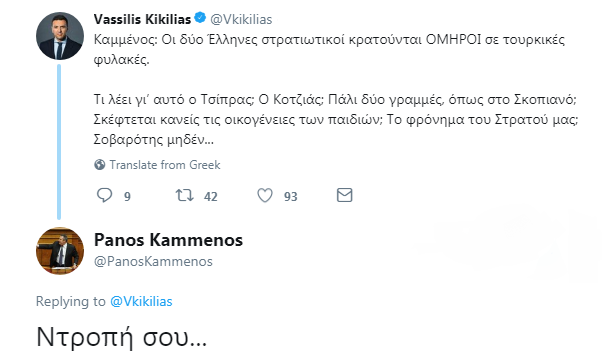 Συγκεκριμένα, ο κ. Κικίλιας, σχολιάζοντας τις δηλώσεις του κ. Καμμένου, σχετικά με τους δύο Έλληνες στρατιωτικούς που κρατούνται στην Τουρκία, τους οποίους ο υπουργός Άμυνας χαρακτήρισε ως «ομήρους», έγραψε στο Twitter: «Καμμένος: Οι δύο Έλληνες στρατιωτικοί κρατούνται ΟΜΗΡΟΙ σε τουρκικές φυλακές. Τι λέει γι’ αυτό ο Τσίπρας; Ο Κοτζιάς; Πάλι δύο γραμμές, όπως στο Σκοπιανό; Σκέφτεται κανείς τις οικογένειες των παιδιών; Το φρόνημα του Στρατού μας; Σοβαρότης μηδέν…».